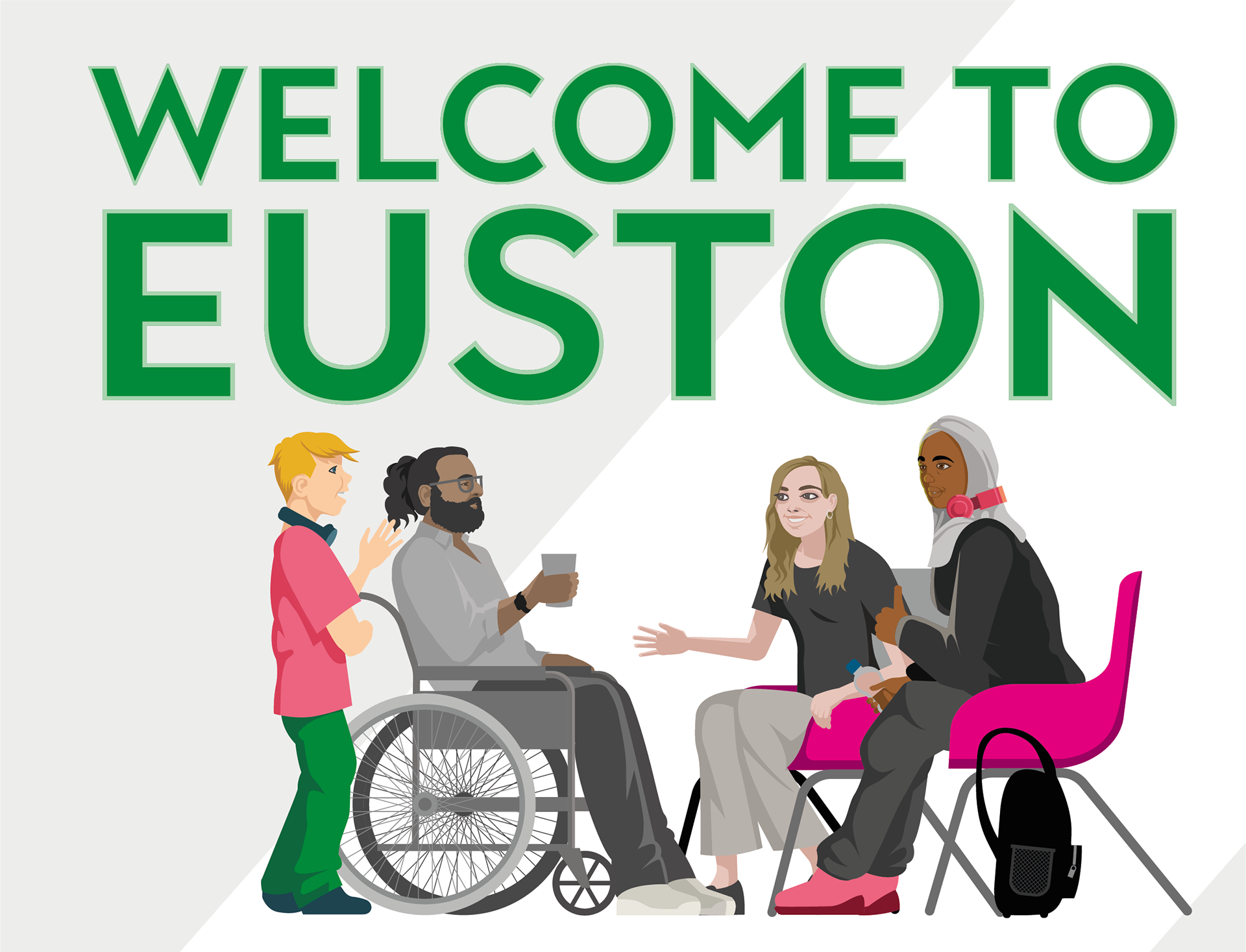 The Euston Hub is a community space run by the Euston Partnership. I was briefed with creating a mural for one of the internal walls, followed by wayfinding signage to guide visitors around.