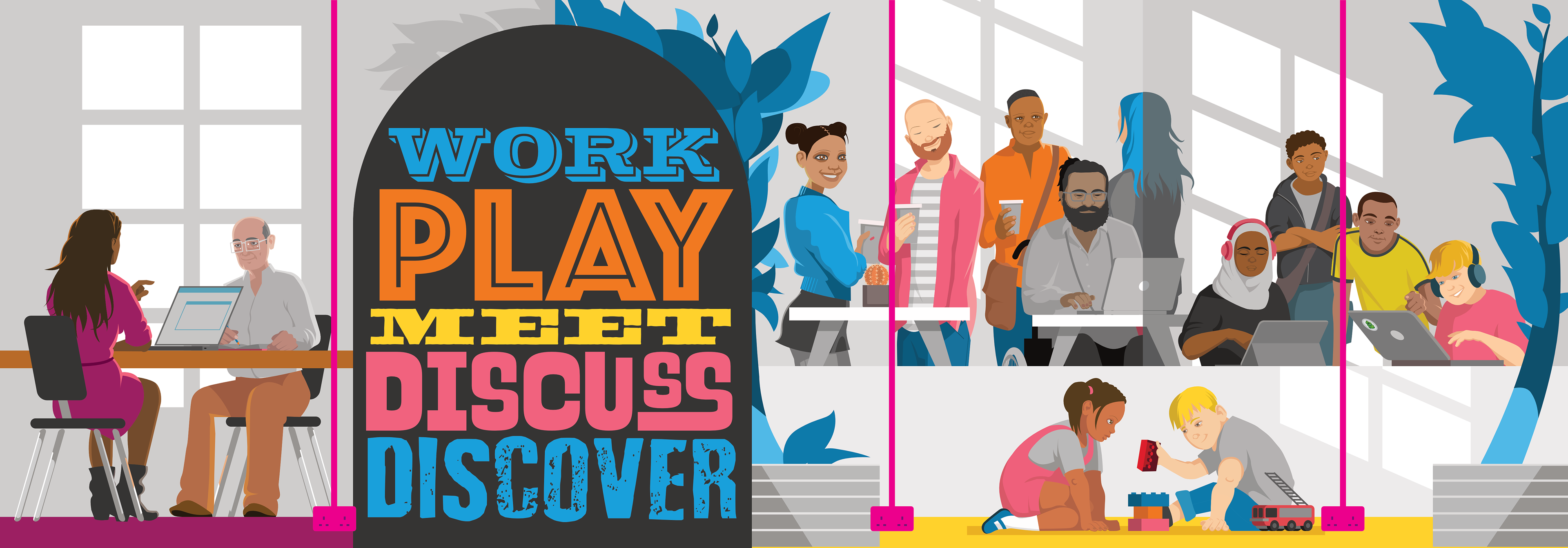 The mural is featured near working desks and a break-out area. Likenesses of real users of the space were used in creating the characters.